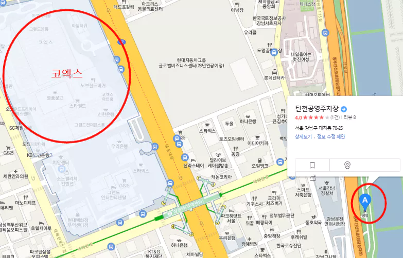 - 코엑스 도보 15분 거리에 있는 탄천 공영주차장을 이용(5분 100원/ 1시간 1200원)하면 매우 저렴합니다.