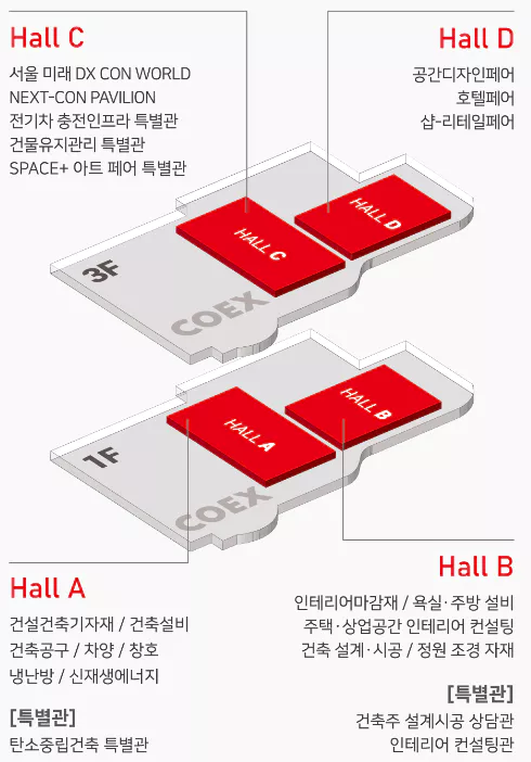 - 인테리어 자재 특별관: 석재, 벽지, 도장재, 루바등 인테리어 마감재 전시