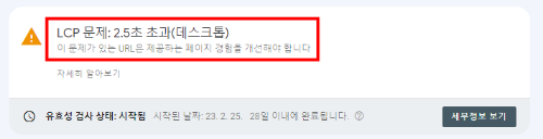 아래 그림은 최근에 제가 받은 경고 문구의 하나입니다. 구글 서치 콘솔에 나온 경고 문구로 LCP에 문제가 있으니 개선 하라는 경고입니다. LCP는 페이지의 메인 콘텐츠가 로딩되기까지 걸린 시간정도로 생각할 수 있는데 기준인 2.5초를 초과한 상태입니다.