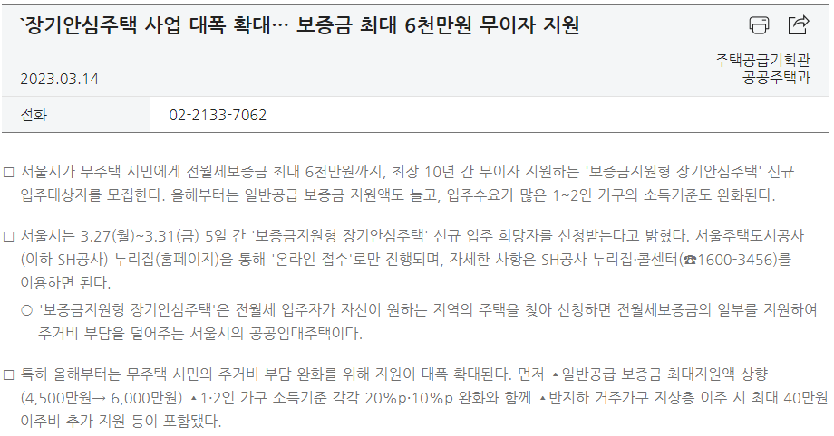 | 2023년 서울시 장기안심주택 주의점, 지원대상, 지원내역 (1) | 2023.03.15 |