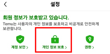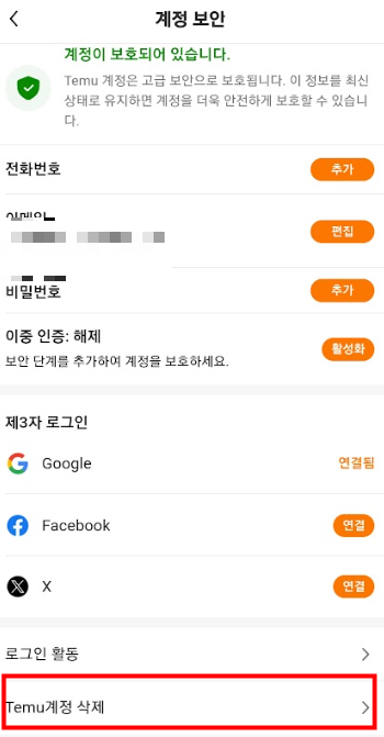 5. 계정 보안 메뉴에서 맨 아래에 Temu 계정 삭제로 들어가세요.