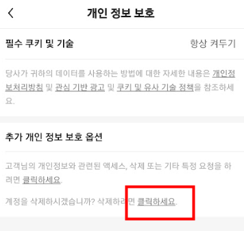 4. 개인 정보 보호 화면에서 '계정을 삭제하시겠습니까? 삭제하려면 클릭하세요.'로 들어갑니다.