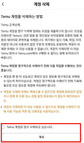 6 계정 삭제 화면에서 'Temu 계정을 영구 삭제하고 싶습니다' 앞을 체크하고 계속을 누르세요.