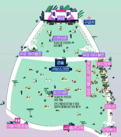 푸드트럭, 포토존, 스탠딩존, 피크닉존, 유료테이블존(입장 후 현장 유료판매), 푸드트럭 테이블(무료), 화장실 위치 확인하시기 바랍니다.