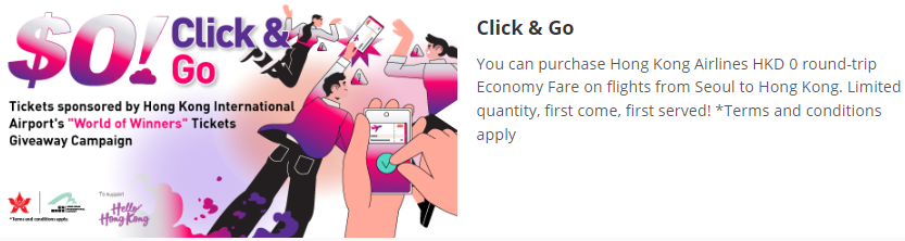 한국어 해석: 0 홍콩달러에 홍콩 왕복 이코노미 좌석을 선착순으로 한정수량 제공.